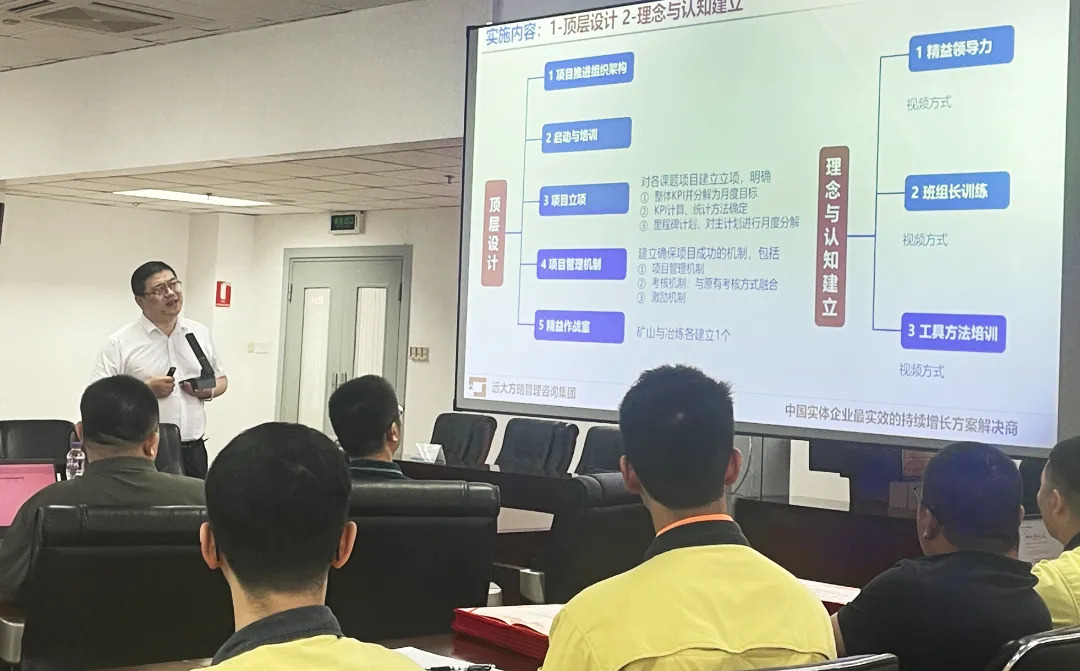 啟動會上,項目組老師首先向中冶瑞木對遠大方略的信任表示感謝,老師介紹了項目的頂層設計,先對整體框架和關鍵要素進行明確和規(guī)劃,主要包括項目推進組織架構,啟動與培訓,項目立項、項目管理機制以及精益作戰(zhàn)室。項目能否成功落地除了框架的建立,理念與認知的建立也是十分重要,要對大家進行相關培訓,包括精益領導力、班組長訓練以及工具方法培訓,提升認知,掌握理論才能更好地落地實踐。