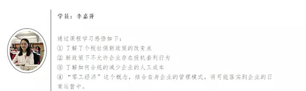 通過鄧雨薇老師的授課講解,學(xué)員們掌握了社保稅收的新政策對比變化,政策與法律對企業(yè)及個人的影響,讓學(xué)員回到企業(yè)設(shè)計出有效的落地方案。