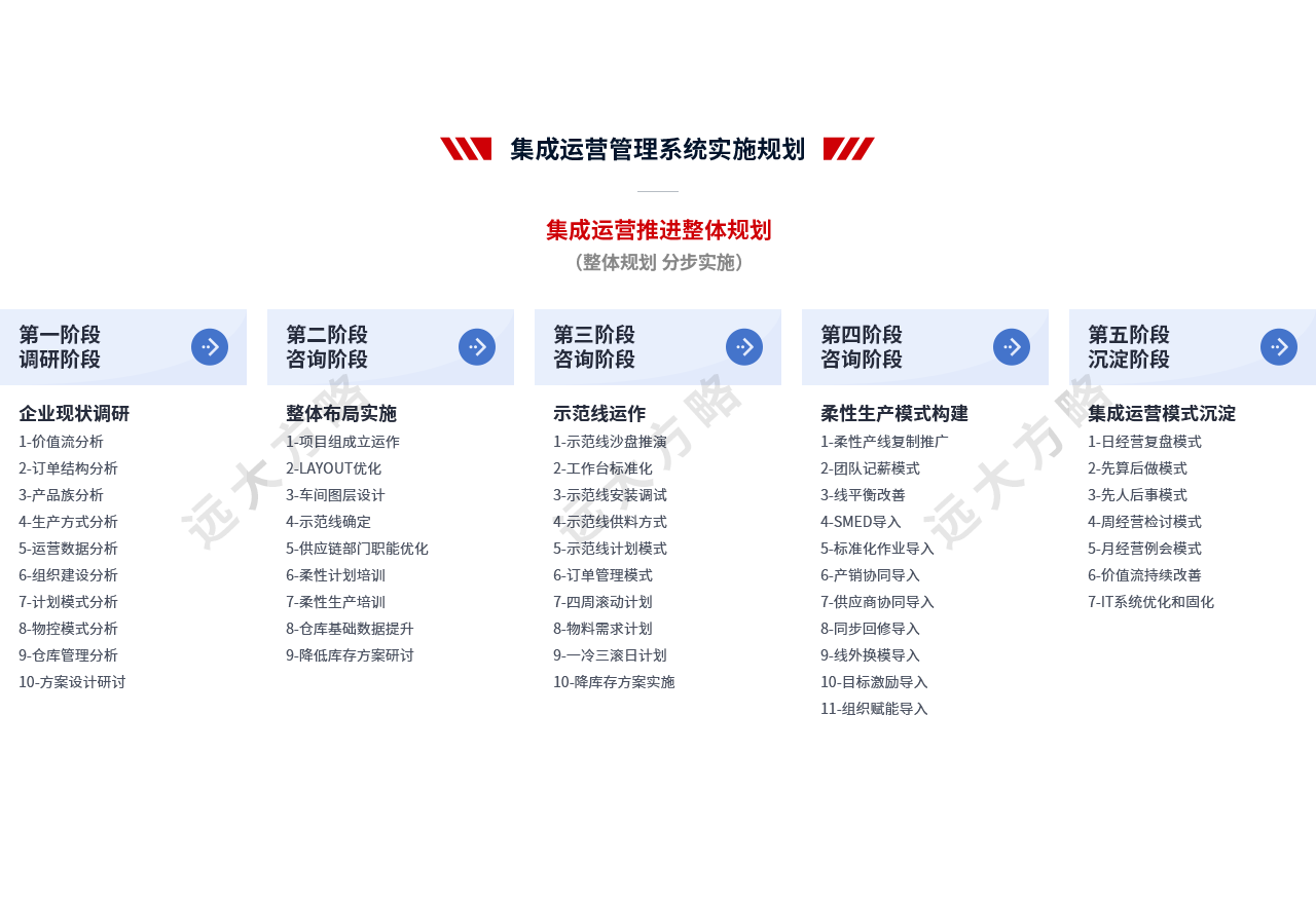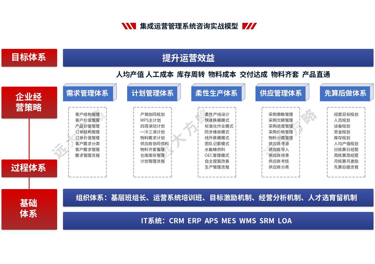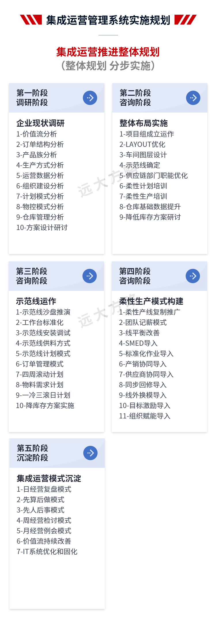 2、輔導(dǎo)模塊:推行卓越運(yùn)營(yíng)管理,主要圍繞經(jīng)營(yíng)管理中心建立、計(jì)劃信息鏈與組織運(yùn)作信息鏈構(gòu)建、精益生產(chǎn)模式優(yōu)化等