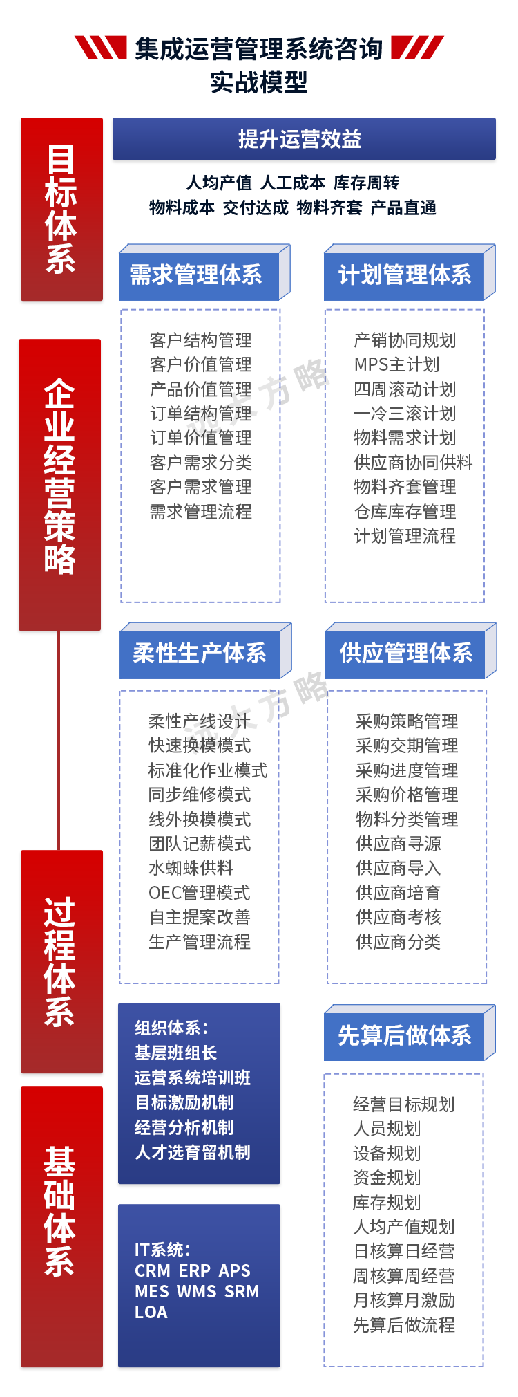 2、輔導(dǎo)模塊:推行卓越運(yùn)營(yíng)管理,主要從戰(zhàn)略規(guī)劃與經(jīng)營(yíng)計(jì)劃、組織架構(gòu)優(yōu)化與責(zé)權(quán)利系統(tǒng)構(gòu)建、核心業(yè)務(wù)流程梳理、目標(biāo)與數(shù)據(jù)信息體系構(gòu)建、 自主運(yùn)營(yíng)體系構(gòu)建等方面做改善